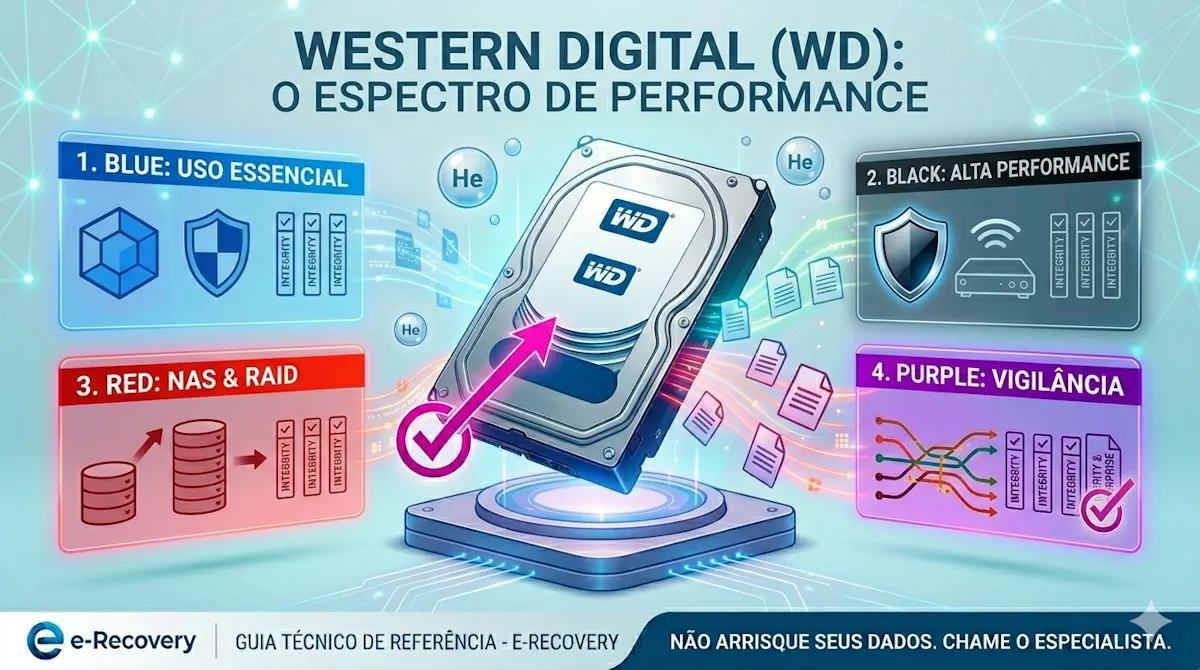 Não deixe a complexidade das cores WD confundir a segurança dos seus dados. Seja um WD Red em RAID ou um WD Black de alta performance, a E-Recovery possui a expertise técnica para diagnosticar e recuperar suas informações com precisão cirúrgica. Solicitar Diagnóstico Especializado Western Digital!